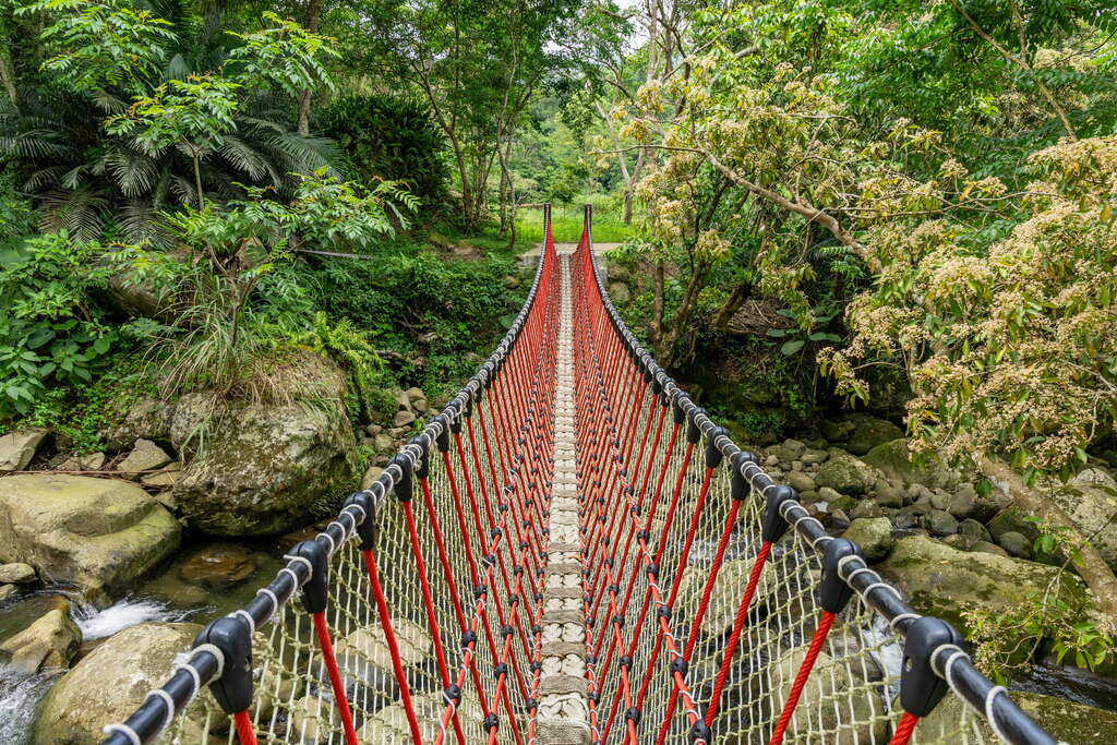 步道沿高遶溪迂迴前行,溪水清澈見魚,溪床大小石頭林立,形成天然灘池。途中設有富泰雅族色彩的紅色繩索吊橋,全長21公尺,每次限5人通行,行走時會搖晃,增添刺激感。步道兩旁林木蒼翠,果園與竹林相間,每年五月桂竹筍豐收。步道終點可回到羅馬公路,並連接附近咖啡店,適合享受自然散步與悠閒咖啡時光。