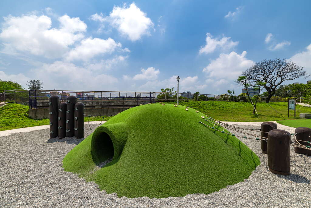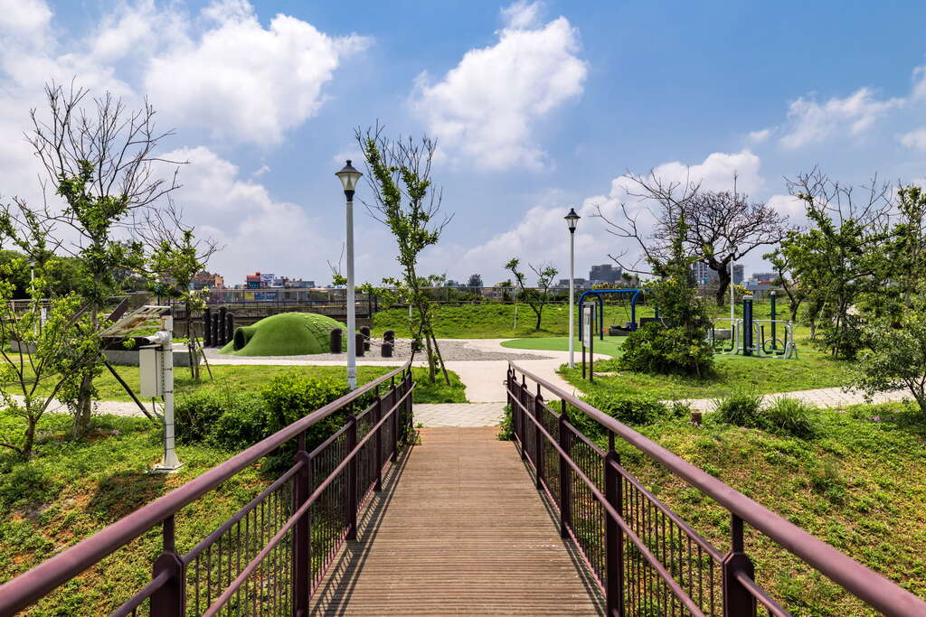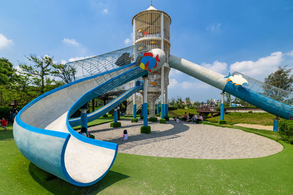 公園設施多元,包括攀爬網、小山丘、盪鞦韆與體健設施,適合親子同遊、放電運動;同時設有環湖景觀步道,採無障礙設計,讓旅人能在湖畔悠閒散步、享受自然景致。整體空間兼顧遊戲、休閒與在地文化,是輕鬆放鬆的好去處。