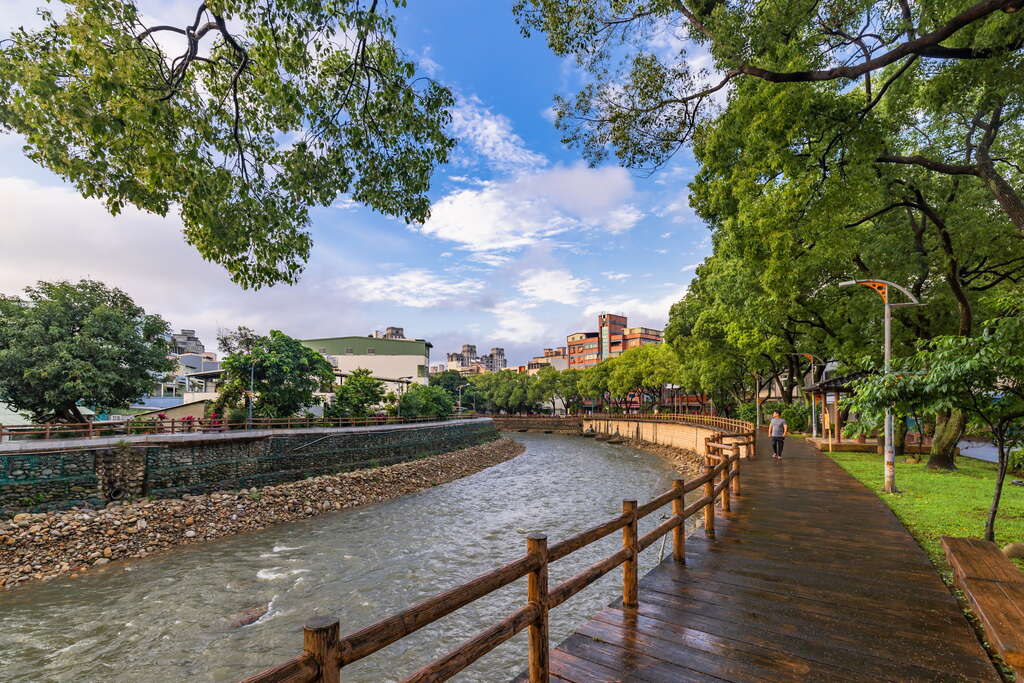 源自龍潭的老街溪,向北一路流經了平鎮、中壢、大園等區域,也因為途中流經了中壢老街而得名,可說是中壢市重要河川。而老街溪步道約5.2公里長,自平鎮八字圳水岸公園開始,延伸至中壢環北路,沿路串起新勢公園、河岸公園、河川教育中心,還有歷史悠久的新光福德宮。它不只是城市中的一條綠帶,更像是生活裡的一道靜謐通道。