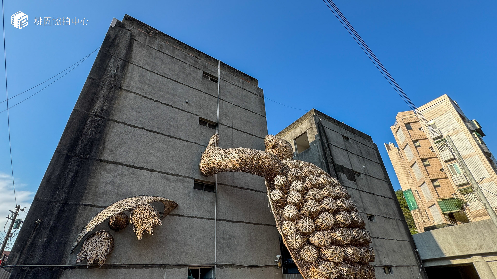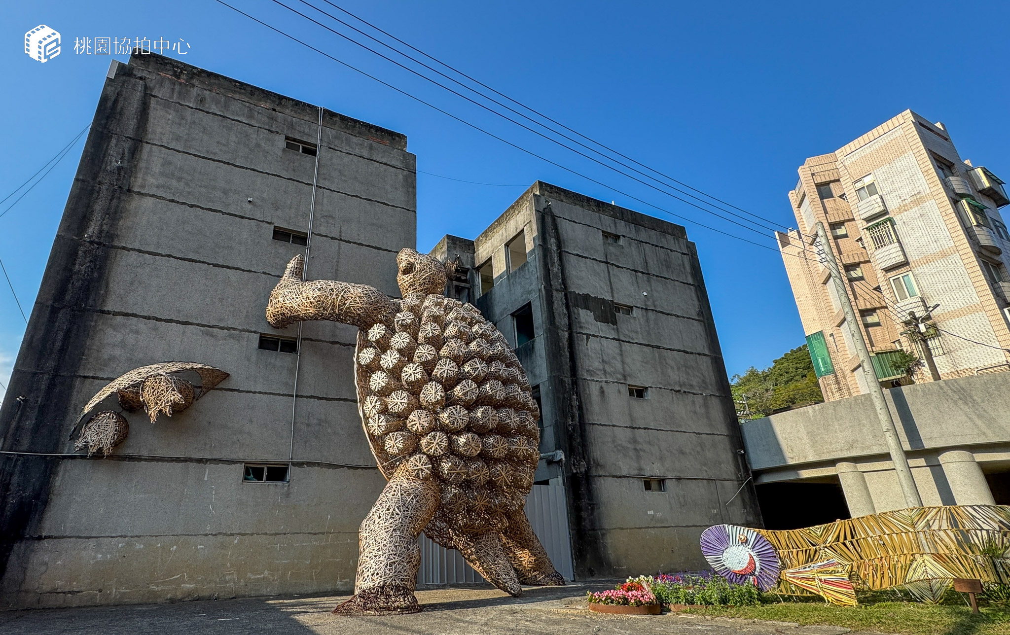 2024桃園地景藝術節,桃園市政府文化局特別於憲光二村推出亮點作品,在待修復的兩棟公寓式眷舍之間,矗立著一件令人驚嘆的藝術品—<龜吉拉的守護>。近8米高的龜吉拉,以其雄偉的身姿,守護著期待新生的舊公寓眷舍,見證時代的變遷,同時也守望著龜山的未來。
