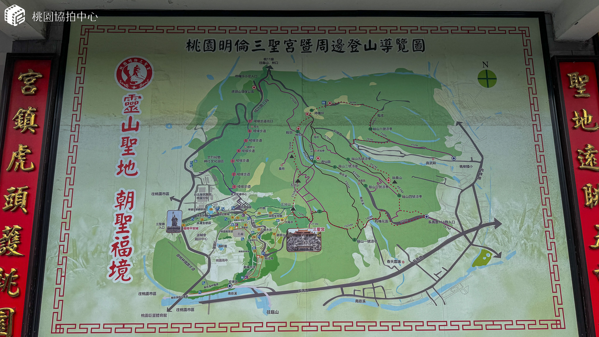 桃園明倫三聖宮位於桃園虎頭山麓,下臨虎頭山公園、南崁溪、忠烈祠,原名明倫乾院,供奉關聖帝君、呂純陽帝君、九天司命真君等「三聖恩主」,後遷至虎頭山,於民國六十四年三聖恩主、觀世音菩薩、天上聖母等神像入廟安座,為入廟紀念日,並奉諭改稱明倫三聖宮。桃園明倫三聖宮於民國六十八年落成,其建築承襲了傳統寺廟文化的精髓,展現充滿活力的藝術風格。