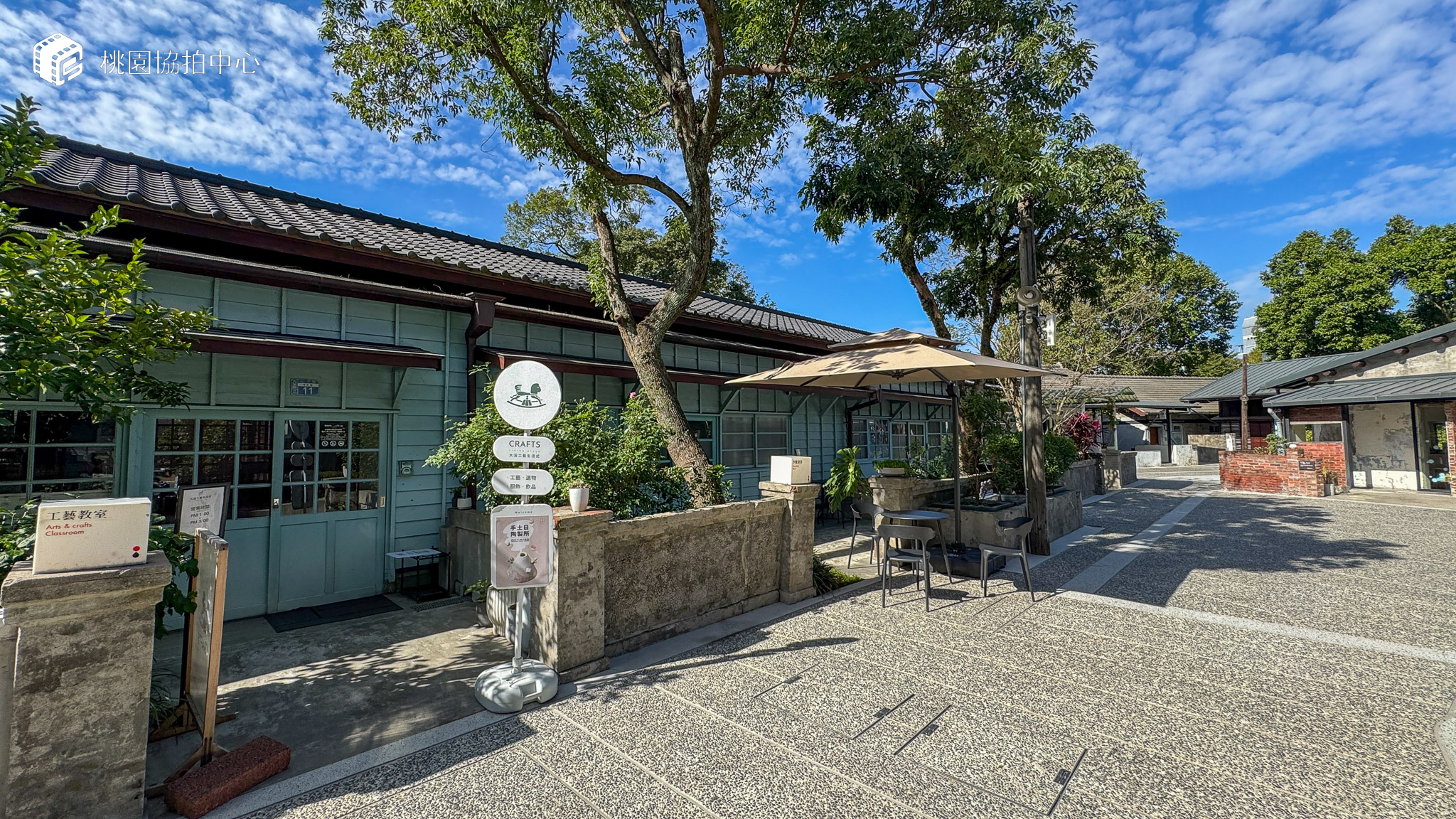 《工藝交流館》本建築興建於日治時期,是本區警察宿舍群唯一座敷空間有寄棟式屋頂,從屬空間應接室為切妻式屋頂,室內格局樣貌亦不同於本區其他棟;戰後作為大溪分局警察宿舍,修復時保留原建築特色及戰後住戶增建圍牆痕跡,2021年再利用為工藝交流館,是生活工藝的展示、交流空間,創造地方木藝與多元工藝及產業連結。
