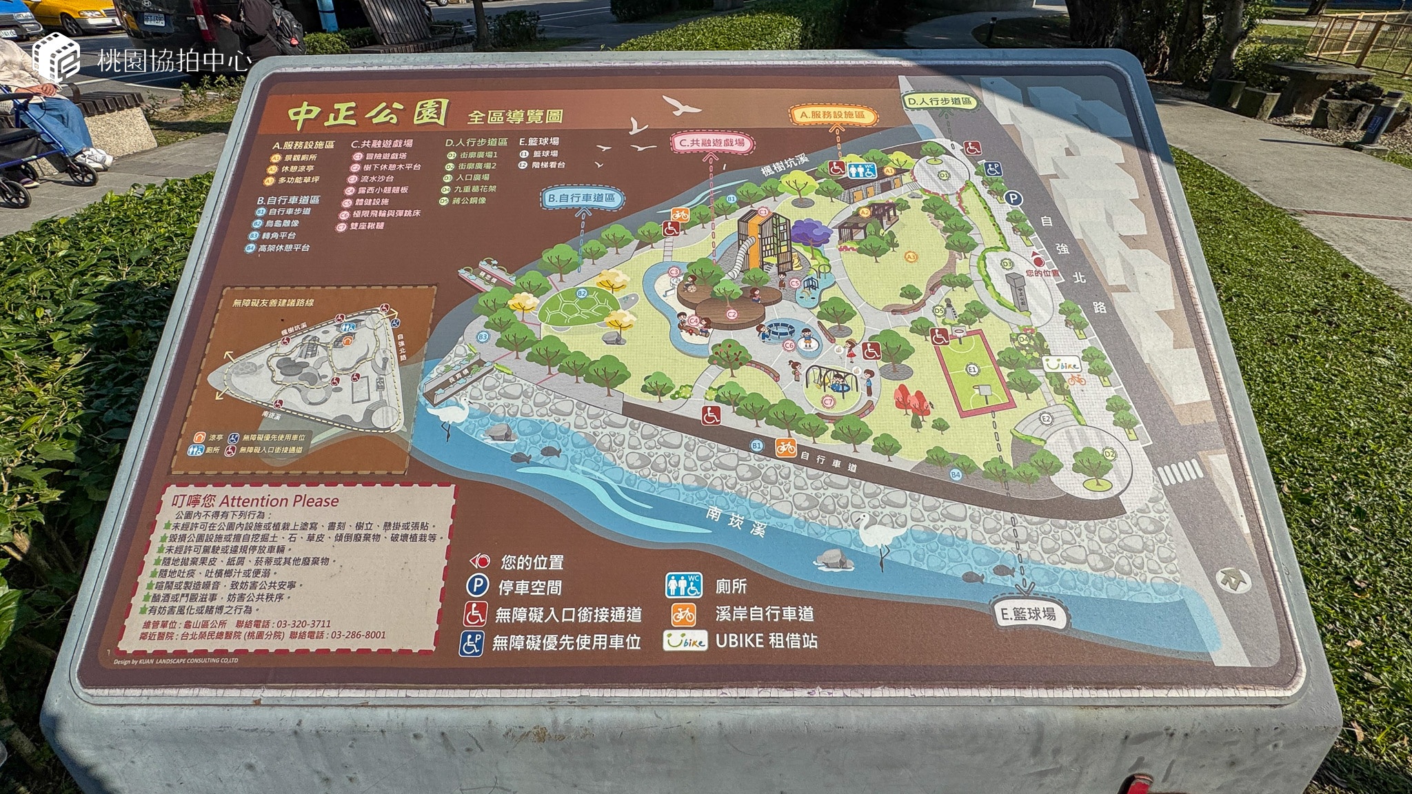 中正公園位於陸光三村、精忠五村旁,自強北路與南崁溪交界處,為龜山區最早開闢的公園。