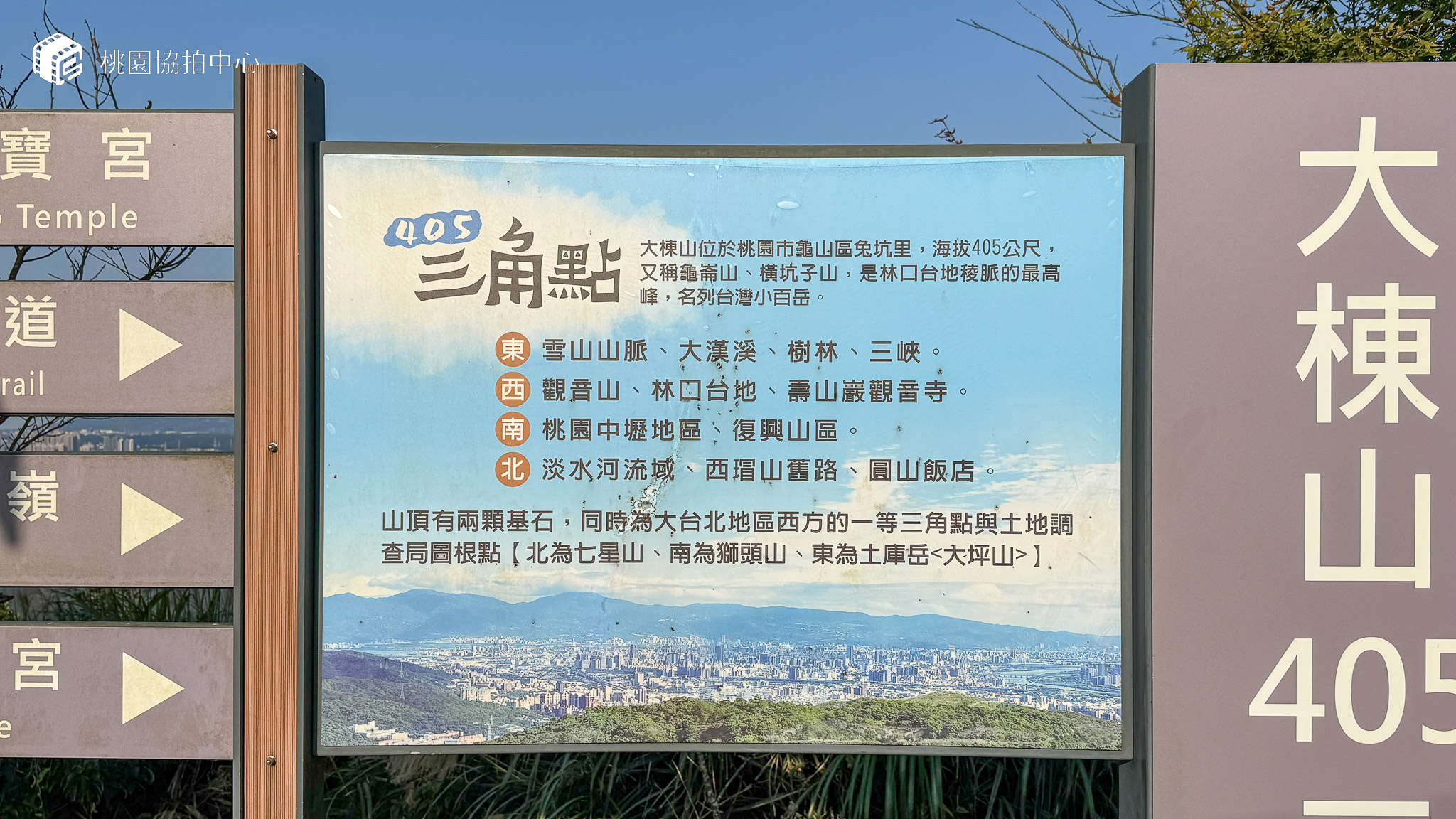 大棟山位於桃園與新北交界,海拔 405 公尺,被列為台灣小百岳之一,又因地勢突出而有「405 高地」之稱。山頂設有一等三角點,展望十分開闊,從桃園市區、新北城景一路延伸至台北 101,晴天廣闊,夜晚璀璨,是登山、攝影與賞景愛好者的熱門去處。