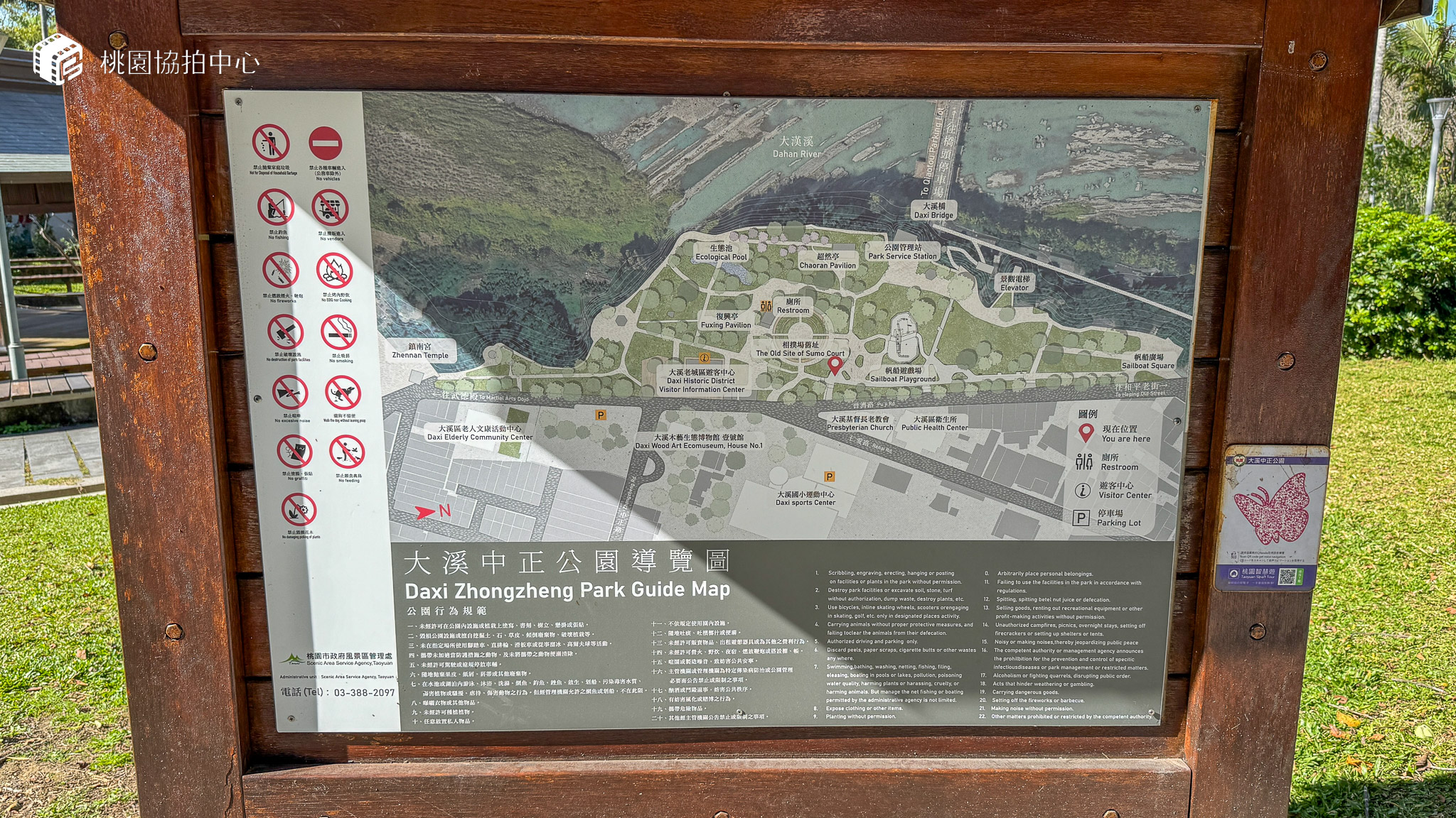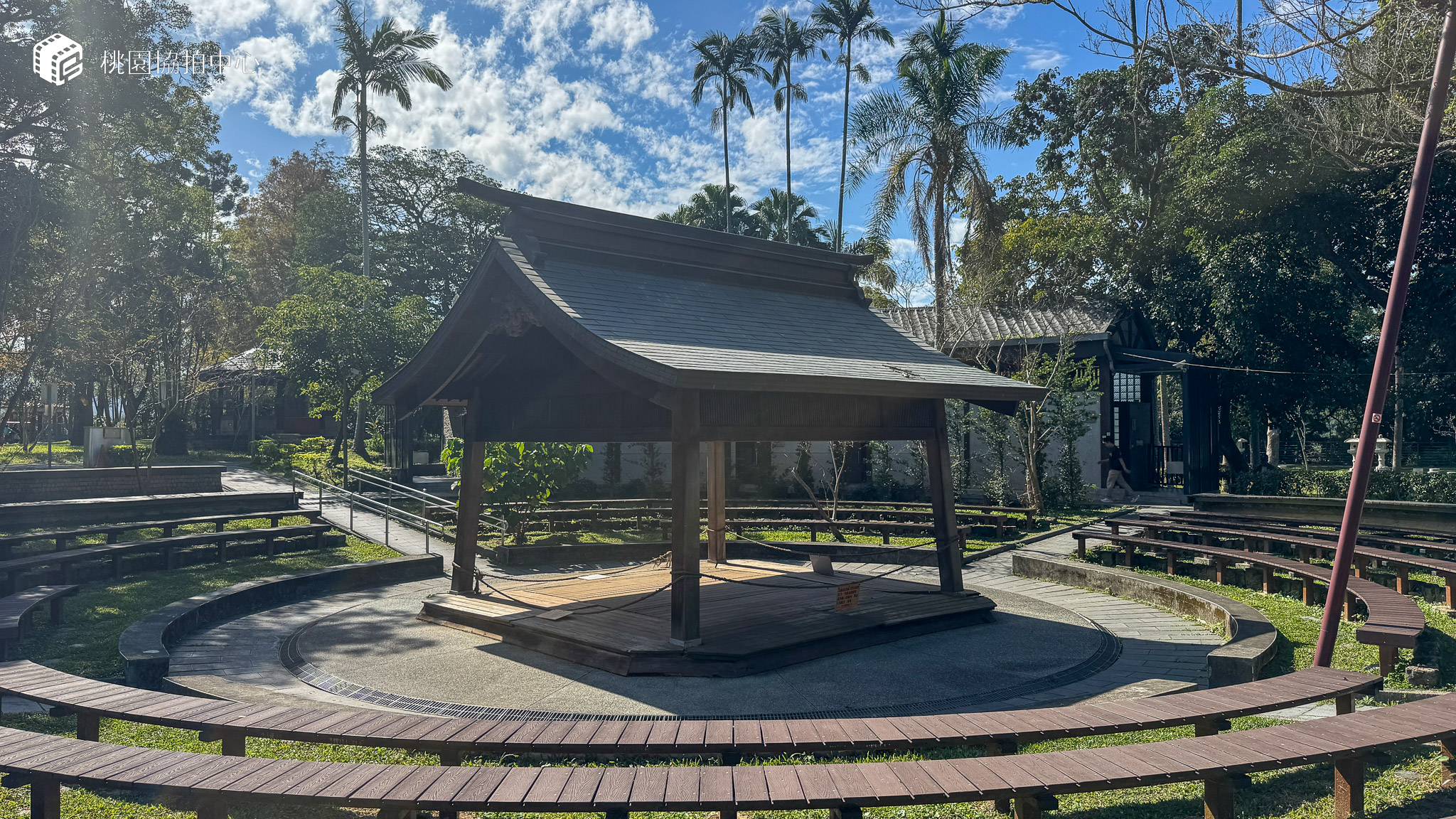 公園中央的「大溪相撲場」,矗立一座原木搭建的唐代涼亭。風格古樸的建築構想出自於在地木工師傅,實心檜木打造的梁柱未見任何鋼釘,顯見大溪木藝之精湛﹔頗具流線感的屋頂以黑銅瓦層層包覆,日式懷舊感伴隨著檜木香氣,引人想像昔日的相撲盛況。