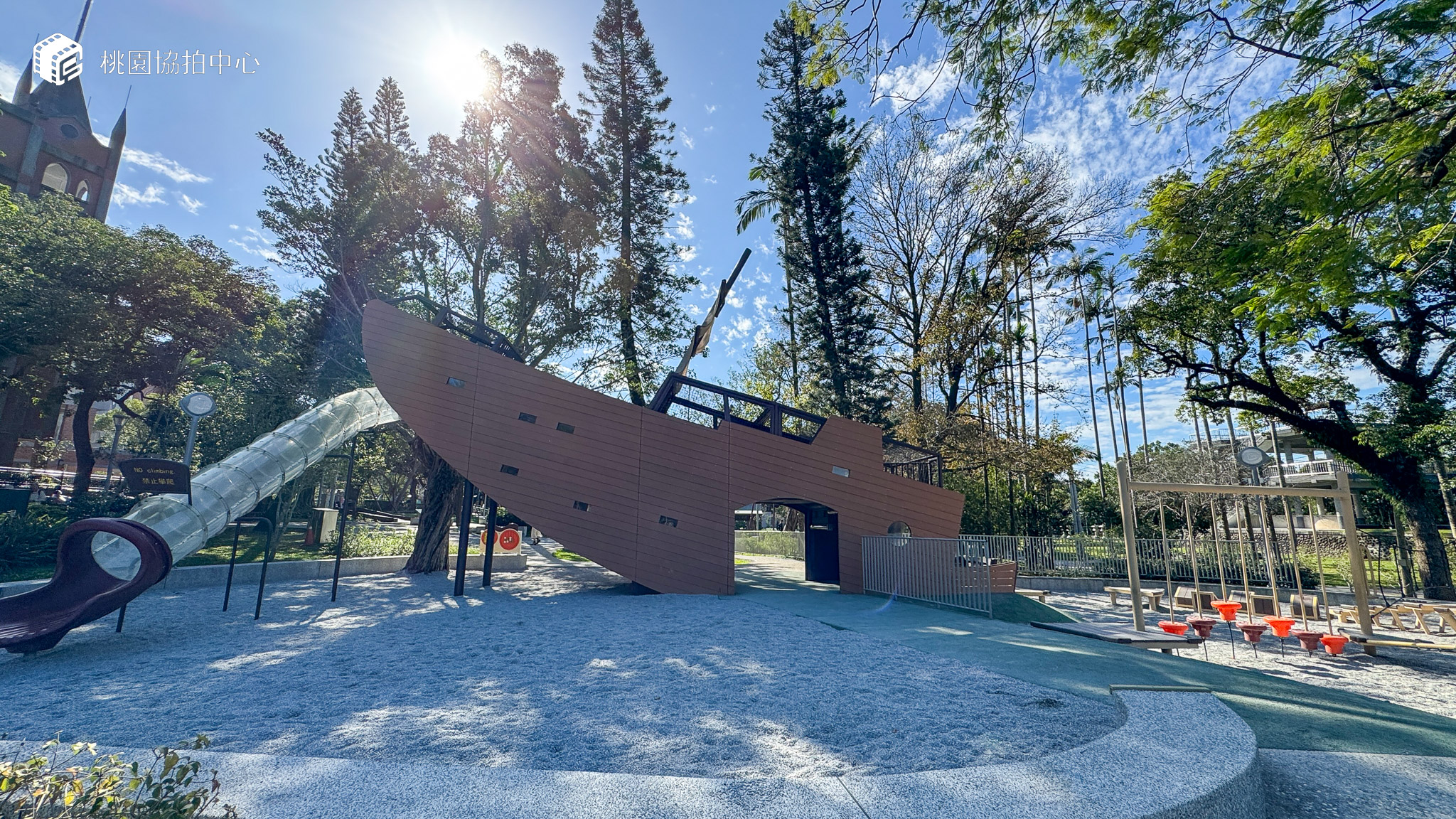 公園內亦有以大溪過往歷史「崁津歸帆」為意象設計之「大船小船」主題兒童遊戲場,其中大船區適合5-12幼童,小船區適合2-12歲幼童,遊戲場呼應大溪過去繁盛的河運文化與歷史,將在地故事融入遊具設計中,融合想像力與探索樂趣,讓孩子們在遊戲中學習與成長。
